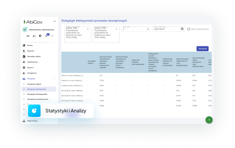 W ramach SZP nie mogło zabraknąć jednej z ważniejszych funkcjonalności jaką są statyki i analizy procesów. System w szczególności zbiera dane w czasie rzeczywistym z realizacji poszczególnych czynności w ramach zaprojektowanych procesów i na tej podstawie generuje różne statystyki. Są to: