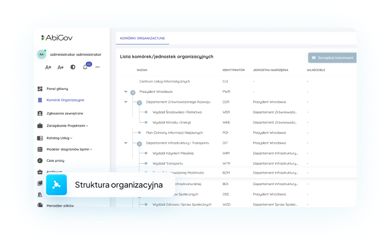 Struktura organizacyjna jest istotnym elementem Systemu z uwagi na uprawnienia i dostępy w systemie zależne od tej struktury. W tym miejscu znajduje się w pełni sformalizowana i oficjalnie przedstawiona informacja na temat struktury organizacyjnej urzędu w postaci wielopoziomowego drzewa.
