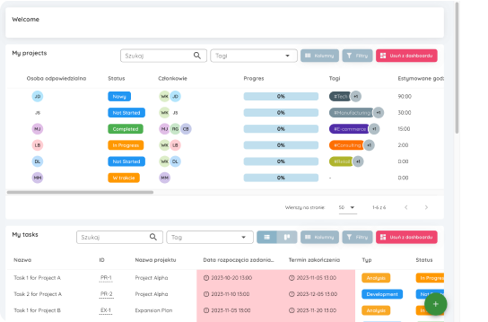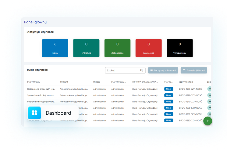 Rozbudowany dashboard, na którym pracownicy w łatwy i szybki sposób mogą weryfikować jakie zadania mają do zrealizowania w ramach procesów.