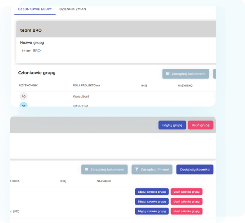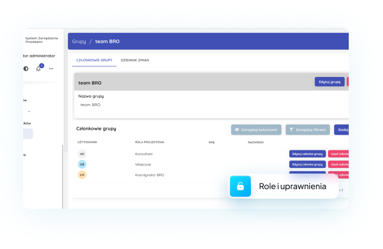 Każdy moduł posiada bardzo szeroko definiowany zakres uprawnień. Do każdego pracownika możemy podpiąć kilka różnych ról w ramach całego systemu. Każdy pracownik może posiadać różne role w ramach różnych projektów. W systemie dostępna jest również możliwość tworzenia grup...