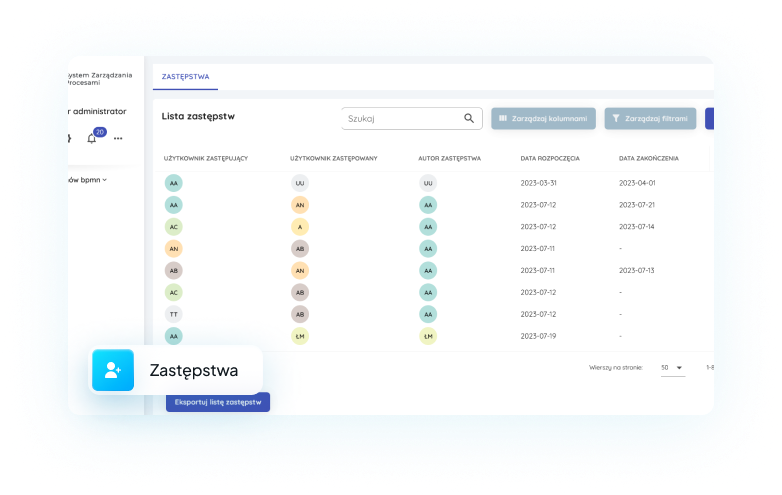 W celu utrzymania ciągłości operacyjnej, system SZP posiada mechanizm zastępstw, który umożliwia przeniesienie wszystkich zaplanowanych do wykonania zadań, na inną osobę, pełniącą rolę zastępcy w przypadku nieobecności pracownika odpowiedzialnego za dane zadania. Zastępstwo zawsze jest ustalane czasowo i tylko w danym czasie osoba zastępująca będzie mogła przejąć obowiązki zastępowanego pracownika.