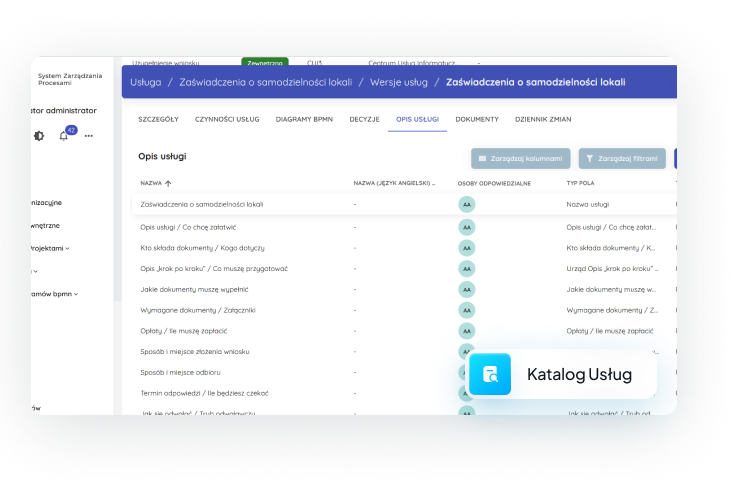 Modeler diagramów BPMN służy również do tworzenia obiegu formularzy oraz opisów na potrzeby katalogu usług.