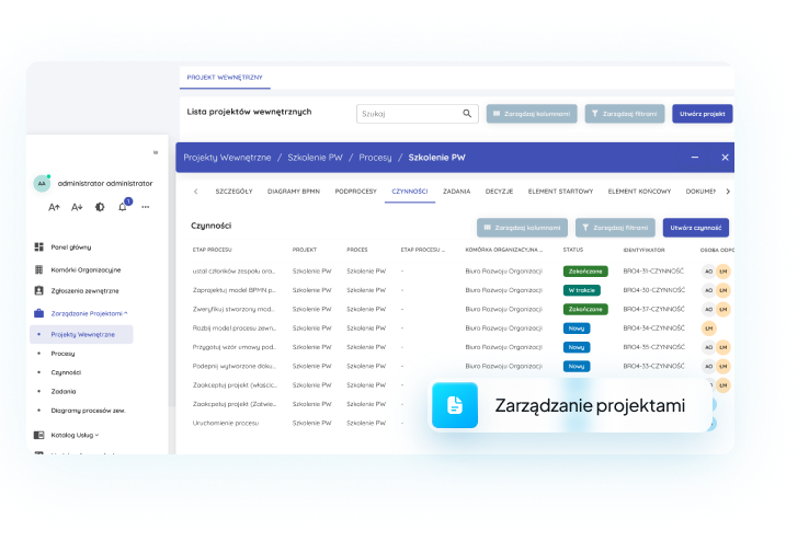 Projekty są realizowane w podziale na dwa procesy: Projekty wewnętrzne zawierają proces zarządczy, w ramach którego planujemy czynności i prace do zrealizowania, celem których jest wypracowanie procesu zewnętrznego (np. procesu w ramach SWOS)